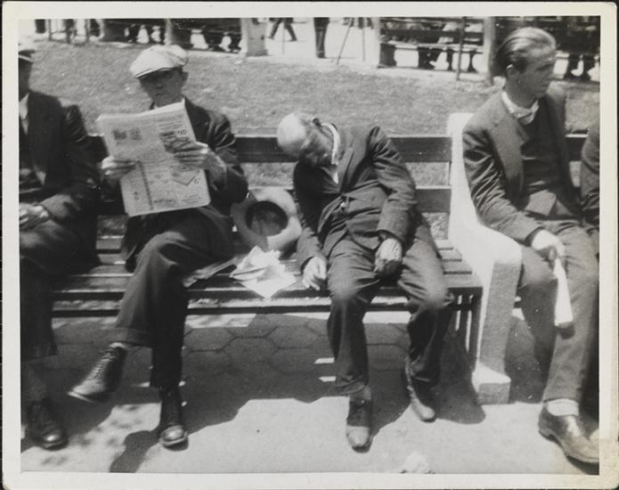 [Destitute men sitting on park bench.]