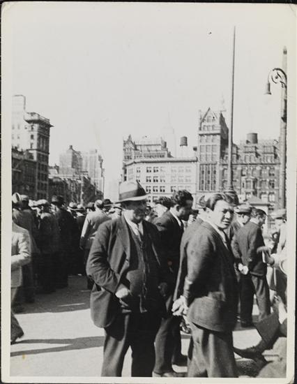 [Destitute men sleeping in front of George Washington statue at Union Square.]