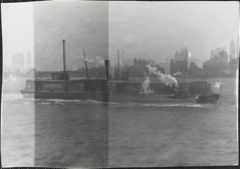 [Views of New York Harbor and double exposure of ferryboat with unidentified image.]