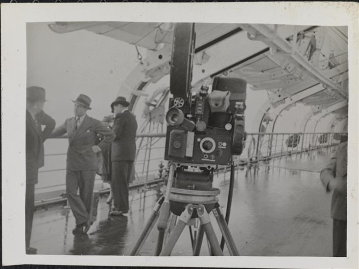 [Newsreel equipment on deck of ship.]