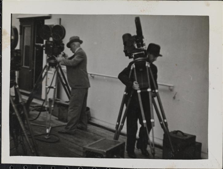 [Newsreel cameras on deck of ship.]