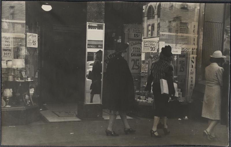 [Unidentified man working in studio, Felicia Marsh, and woman walking past window display.]