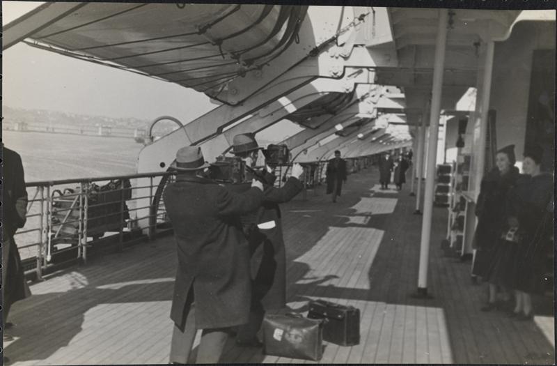 [Newsreel cameras on deck of ship.]