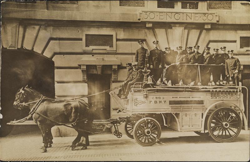 Fire Dept., Engine Co. #30, Horse Drawn Engine and Men.