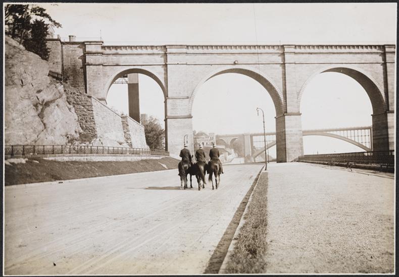 [A. Pedestrians on Brooklyn Bridge ; B. Brooklyn Bridge.]
