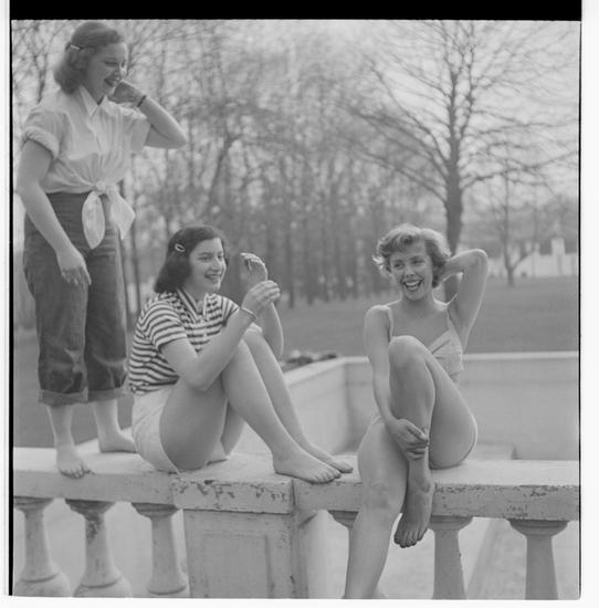 Betsy Von Furstenberg [Sitting on a banister with friends.]