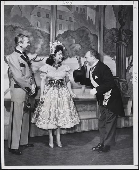 [Ethel Merman as Mrs. Sally Adams and Paul Lukas as Cosmo Constantine in "Call Me Madam".]