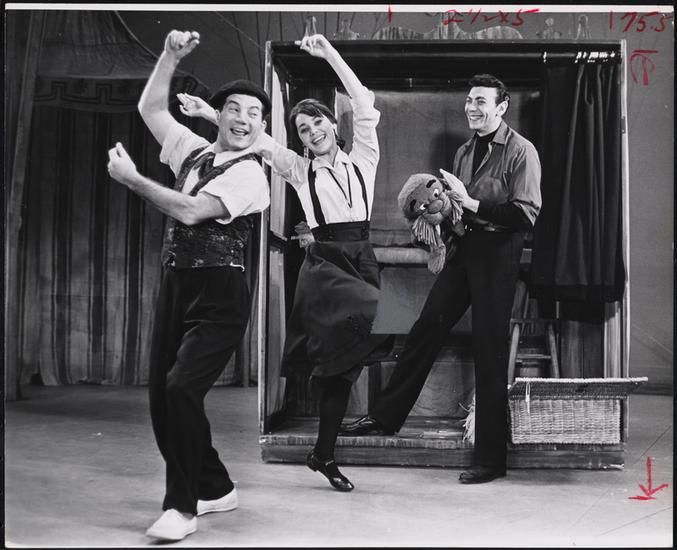 [Jonathan Lucas as Marco the Magnificent, Susan Watson as Lili, and Ed Ames as Paul Berthalet in a rehearsal for "Carnival!".]