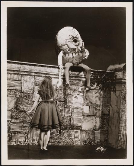 [Josephine Hutchinson as Alice, Burgess Meredith as Tweedledee, and Landon Herrick as Tweedledum in "Alice in Wonderland".]