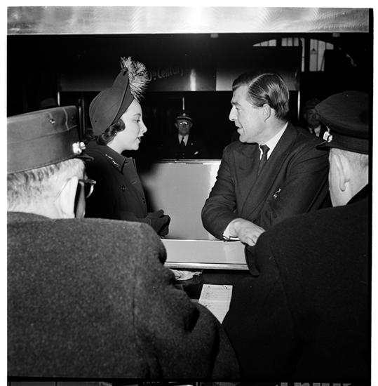 [Bob Elson - 'On the Century' - 20th Century Limited, Radio Interviews. Group talking in the train station]