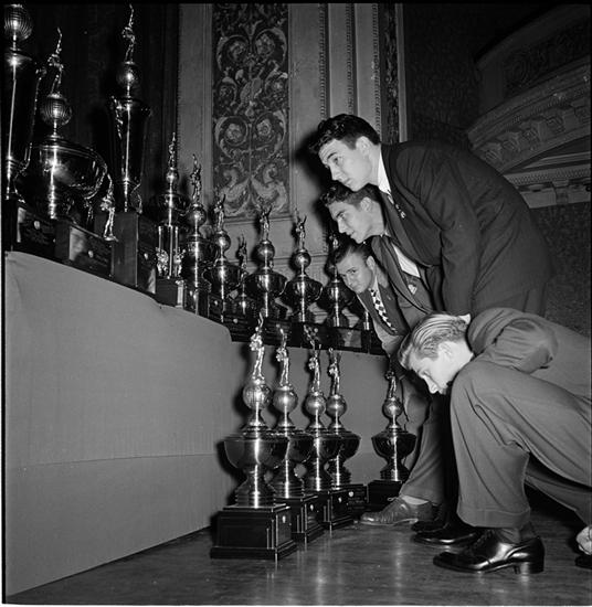 Swing Band Contest Sponsored by LOOK [Boys in front of several trophies.]