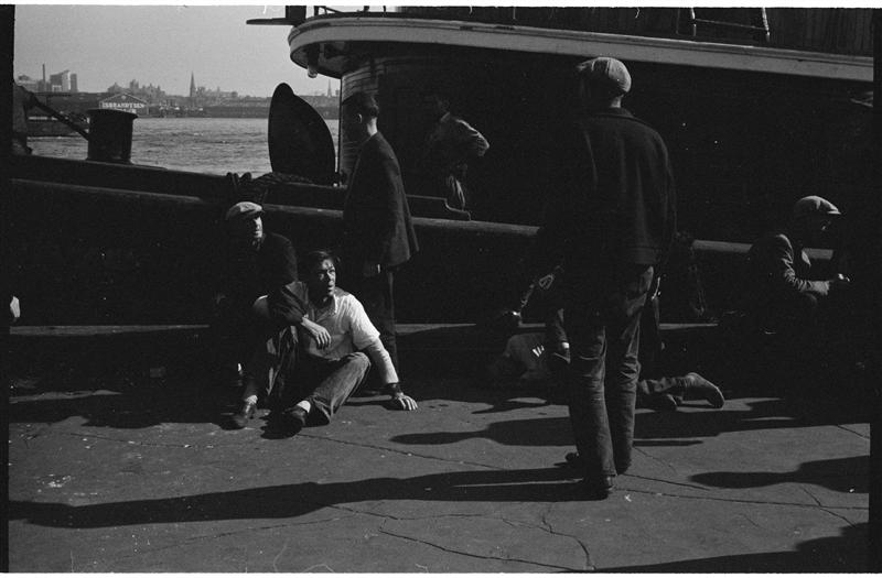 [Destitute men on East River pier with Brooklyn skyline visible.]
