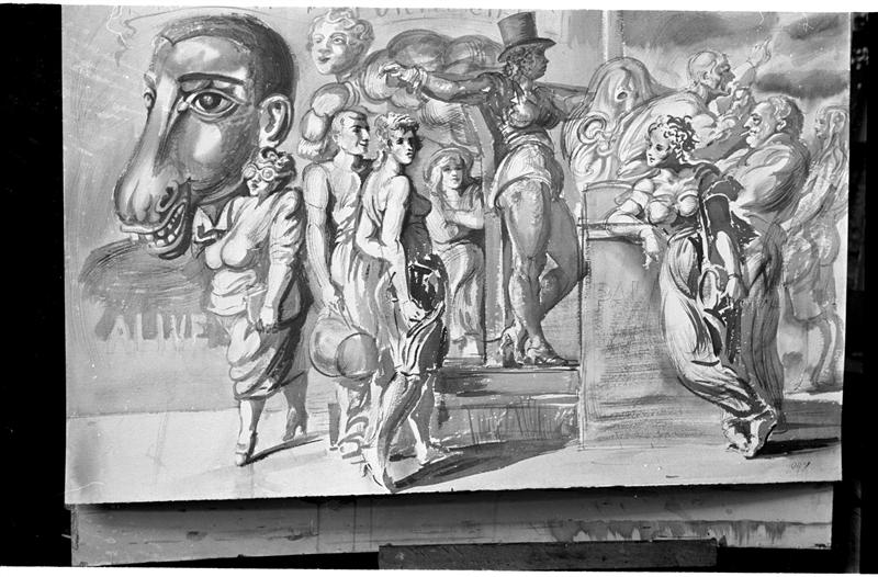[Artwork of women walking past sideshow signs by Reginald Marsh.]
