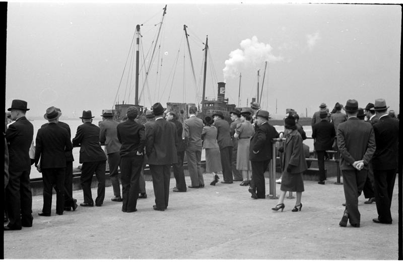 [Men waiting on the dock of the Hoboken Ferry Terminal.]