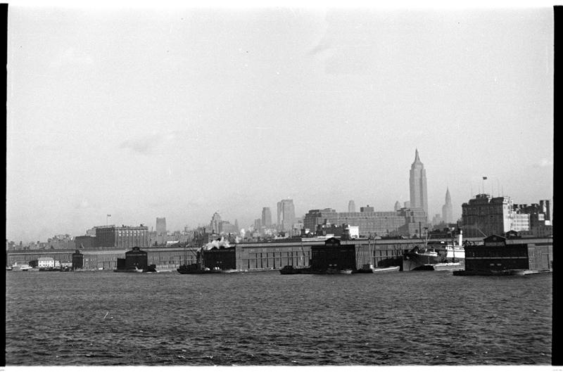 [View of waterfront activity along the Hudson River from deck of ship.]