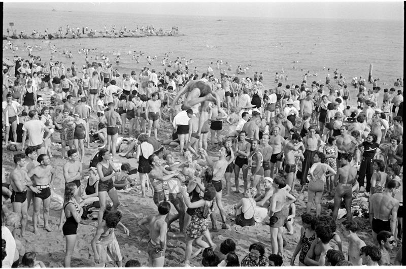 [Group of teenage boys performing stunt on Coney Island beach.]