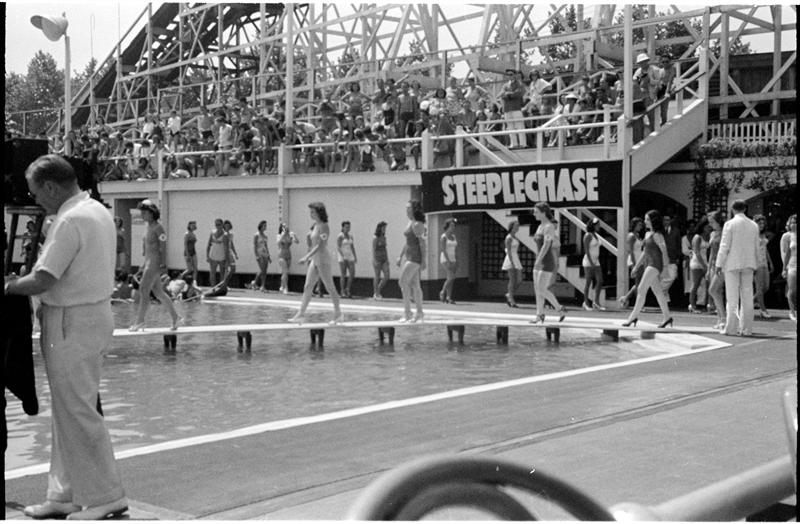 [Woman measuring beauty contestant's waist at Modern Venus Contest.]