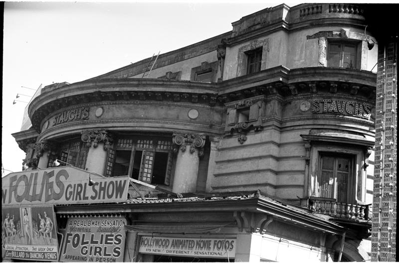 [Sign advertising Follies Girls in front of Stauch's building.]