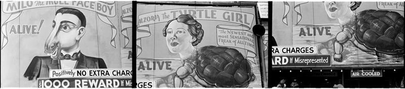 [Sideshow signs featuring Milo the Mule Face Boy and Alzoria the Turtle Girl.]