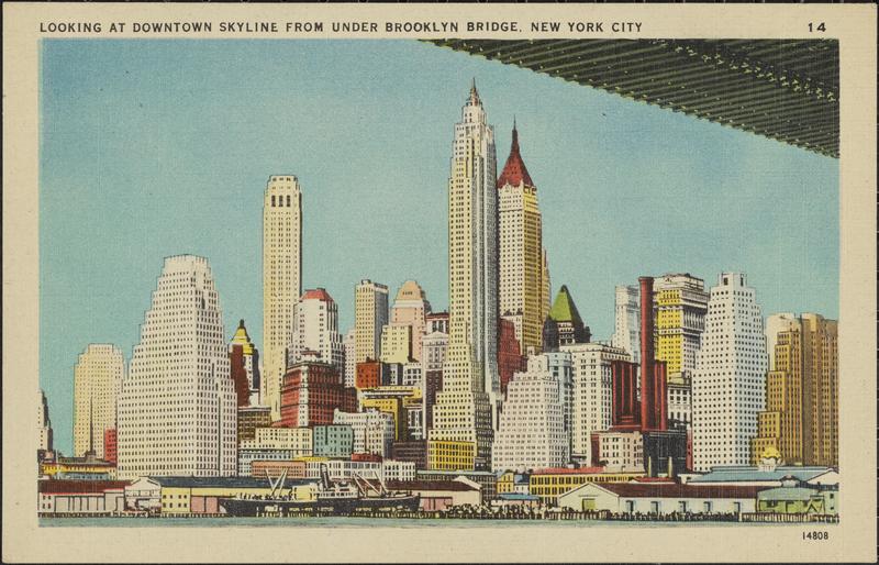 Looking at Downtown Skyline from Under Brooklyn Bridge, New York City