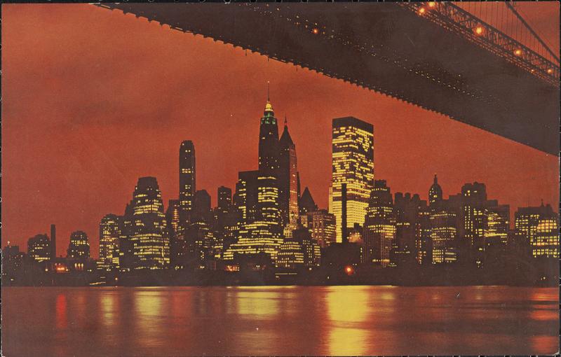Nightfall in Lower Manhattan, with Brooklyn Bridge, New York City