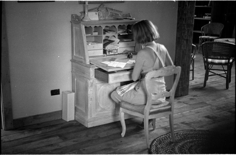 [Felicia Marsh standing next to paintings by Reginald Marsh.]
