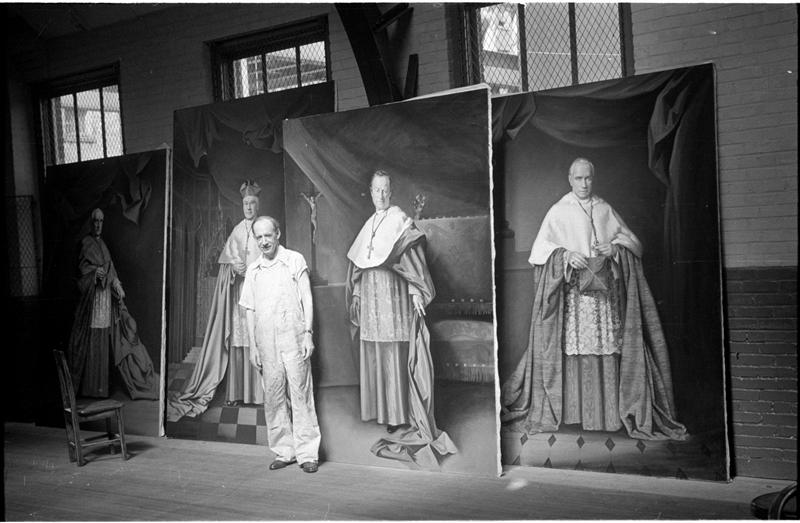 [Man standing next to two full-length portraits of Roman Catholic clergy.]