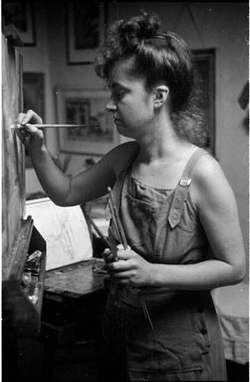 [Felicia Marsh painting outside at Fred Dana Marsh's "Battleship" house in Ormond Beach, Florida.]