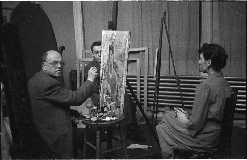 [Felicia Marsh painting outside and paintings by Reginald Marsh.]