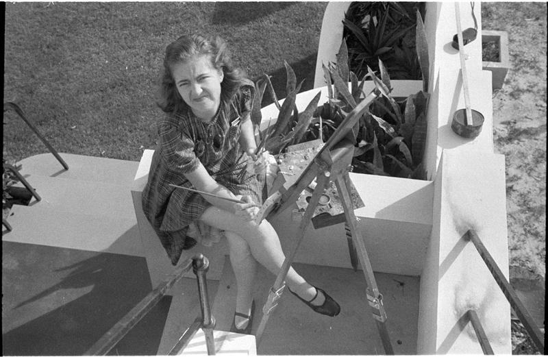 [Felicia Marsh painting outside at Fred Dana Marsh's "Battleship" house in Ormond Beach, Florida.]