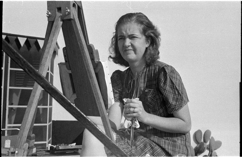 [Felicia Marsh painting outside at Fred Dana Marsh's "Battleship" house in Ormond Beach, Florida.]