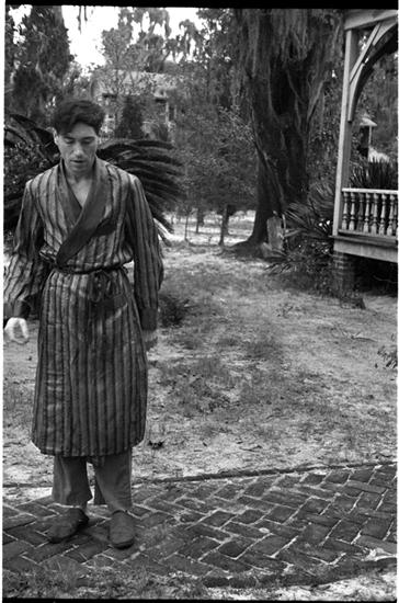 [Reginald Marsh and unidentified man surveying landscape outside of house.]