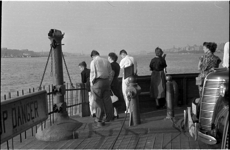 [Felicia Marsh looking at Manhattan skyline from deck of ship.]
