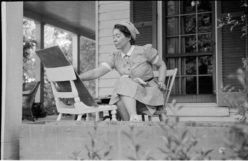[Woman painting on porch.]