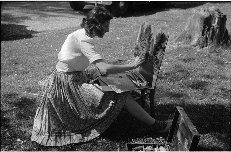 [Felicia Marsh painting outside and paintings by Reginald Marsh.]
