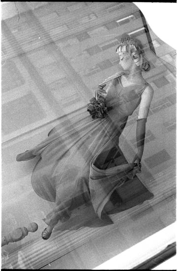 [Pedestrians walking past Bonwit Teller window display.]
