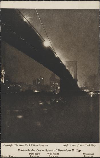 Skyline of Lower Manhattan at Night from Under Brooklyn Bridge, New York City