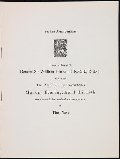 The Pilgrims of the United States Dinner In Honor of General Sir William Horwood, KC.B., D.S.O.