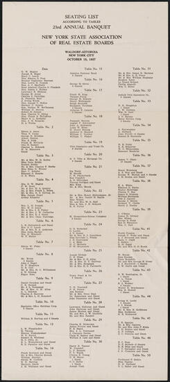 Seating Plan of Fifteenth Annual Dinner of the Real Estate Board of Brokers