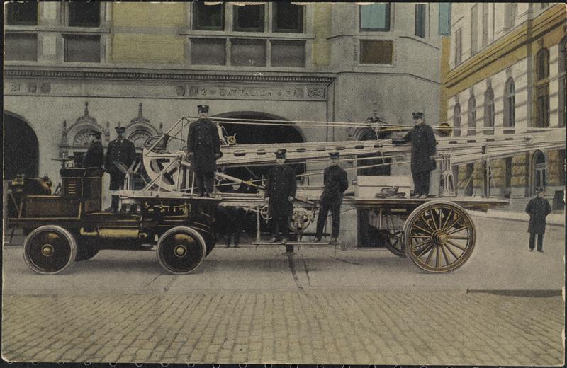 [Group portrait of firemen with equipment outside the station for Engine 12.]