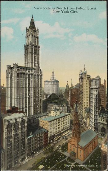 St. Paul's Church, showing Woolworth, St Paul and Park Row Building, New York.