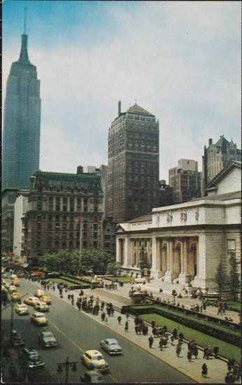 [New York Public Library with Empire State Building in background.]