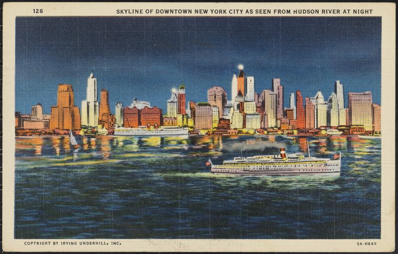 Skyline of Downtown New York as seen from Hudson River at Night.