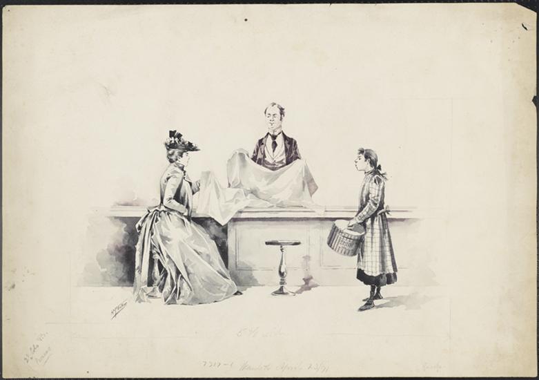 [Sketch of a Woman Standing Between Two Men in an Eastern Setting].