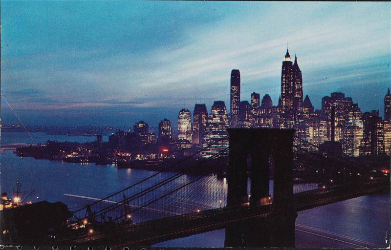 Skyline of Lower Manhattan at Night from Under Brooklyn Bridge, New York City