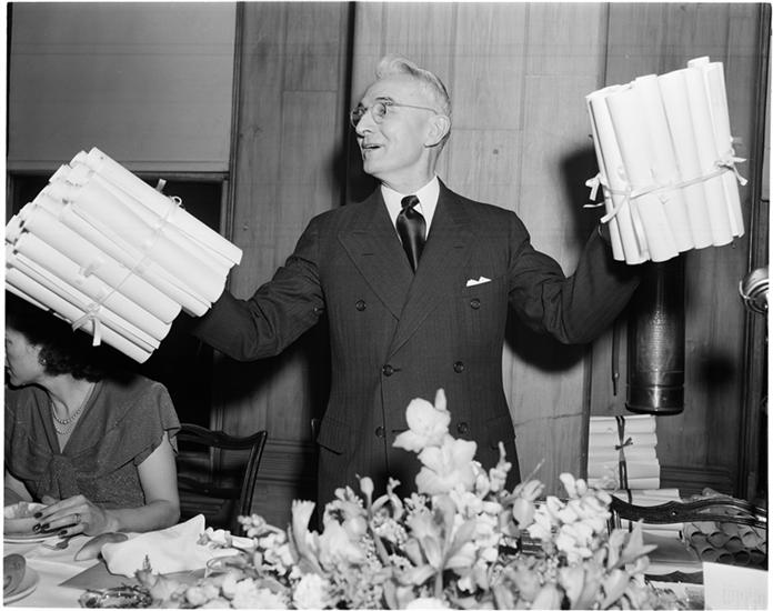 Dale Carnegie [Dale Carnegie holding diplomas.]