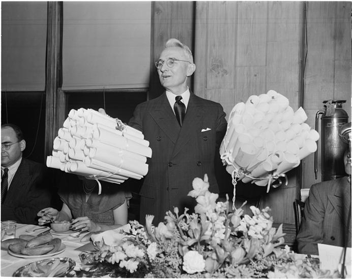 Dale Carnegie [Dale Carnegie holding diplomas.]