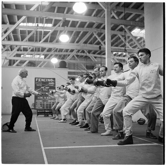 Columbia University [Jimmy Murray, fencing coach, with students.]