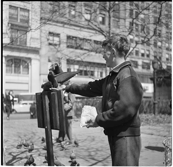 Pigeons [A boy feeding pigeons in a park.]