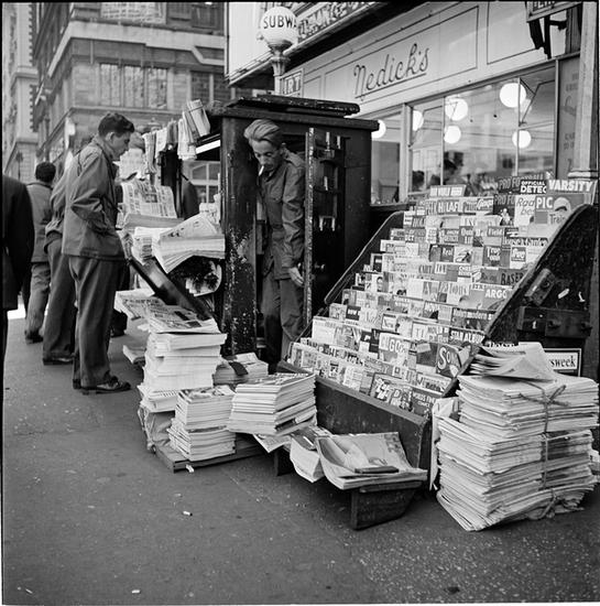 Newsstand | [People browsing through magazine racks at a busy sidewalk newsstand.]